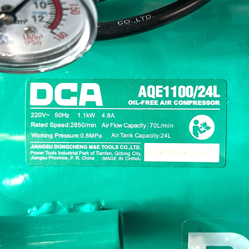 ปั๊มลมแบบ Oil-free จาก DCA รุ่น AQE1100/24L มาพร้อมถังลมความจุ 24 ลิตร เหมาะสำหรับงานที่ต้องการลมแรงและสะอาด โดยไม่ต้องเติมน้ำมันหล่อลื่น ช่วยลดการบำรุงรักษาและป้องกันการปนเปื้อนของน้ำมันในลม เหมาะกับงานอุตสาหกรรมเบา งานพ่นสี งานลมแรงสูง หรืองานที่ต้องการลมคุณภาพดี