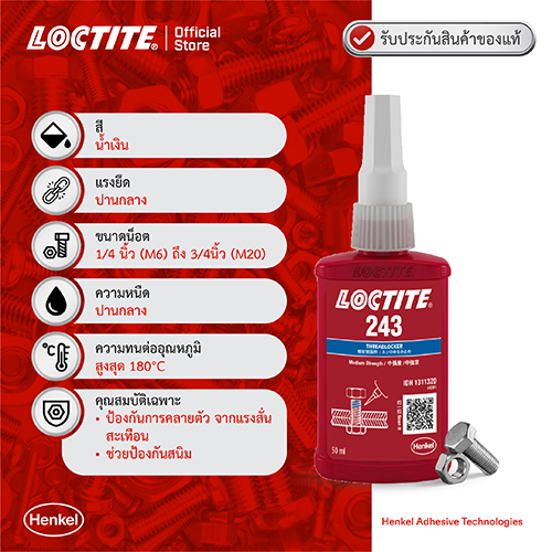 LOCTITE 243 น้ำยาล็อคเกลียว แรงยึดปานกลาง สีน้ำเงิน สำหรับงานทั่วไป ป้องกันการคลายตัวของสลักเกลียว หรือชิ้นส่วนที่ต้องรับแรงสั่นสะเทือน
