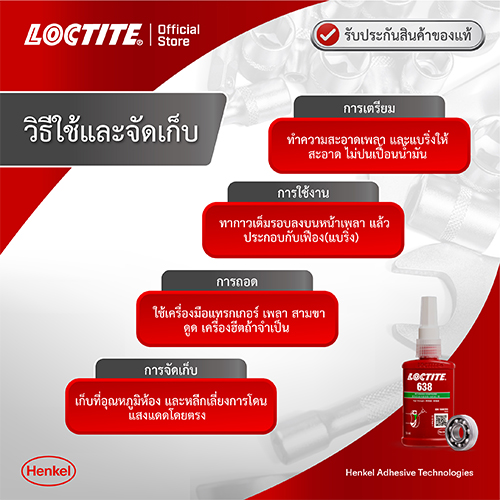 LOCTITE 638 ถูกออกแบบสำหรับการยึดชิ้นส่วนรูปทรงกระบอก สามารถเชื่อมประกอบชิ้นส่วนทรงกระบอกให้ติดกันได้ถึง 0.25 มม. ผลิตภัณฑ์นี้เซตตัวในที่อับอากาศระหว่างโลหะ ช่วยป้องกันการคลายตัวและการรั่วไหลเนื่องจากแรงสะเทือนฉับพลันและการสั่น ไม่เพียงทำงานบนโลหะที่ต้องมีการเคลื่อนที่ได้ แต่ยังใช้งานบนพื้นผิวแบบพาสซีฟ ให้ประสิทธิภาพการเซ็ตตัวที่แข็งแกร่ง เมื่อน้ำยาตรึงเพลาเซตตัวให้แรงยึดสูง แข็งแรง ทนต่ออุณหภูมิ และน้ำมันได้ดี สามารถใช้บนพื้นผิวที่มีการปนเปื้อนได้เล็กน้อย