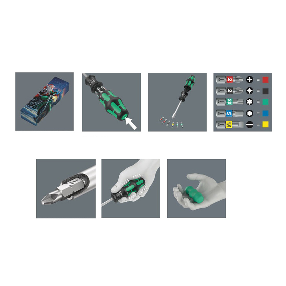 เครื่องมือขนาดกะทัดรัดของ Wera มาพร้อมบรรจุภัณฑ์ของขวัญคริสต์มาสแบบไร้โฆษณาคั่น ของขวัญที่สมบูรณ์แบบสำหรับผู้ที่ชื่นชอบเครื่องมือคุณภาพสูง มาพร้อมที่ยึดดอกไขควงพร้อมด้ามจับ Kraftform ผลิตจากวัสดุหลายชนิดตามหลักสรีรศาสตร์ เพื่อการถอดและประกอบสกรูที่รวดเร็ว ที่จับดอกไขควงมีแม่เหล็กถาวรที่แข็งแรงเพื่อให้มั่นใจว่าดอกไขควงจะยึดติดแน่น ด้ามจับมีแม็กกาซีนดอกไขควง มีดอกไขควง BiTorsion (BTZ) อเนกประสงค์ 6 ดอก BiTorsion