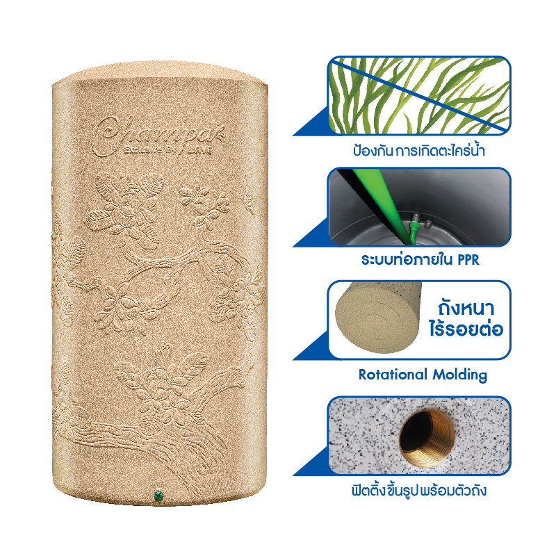 ถังเก็บน้ำบนดิน สำหรับใช้สำรองน้ำไว้ใช้ภายในบ้านและสำนักงาน วัสดุผลิตจากโพลิเมอร์คุณภาพสูง สะอาด ปลอดภัย ไม่เป็นตะไคร่น้ำ ปราศจากสารตะกั่วและปรอท ไร้สารโลหะหนัก แสงแดดไม่สามารถส่องผ่านได้ ไร้กลิ่นอันไม่พึงประสงค์ รูปแบบดีไซน์ใหม่ เน้นความลงตัวกลมกลืนกับธรรมชาติ ทนทานต่อแสงยูวี อายุการใช้งานยาวนาน