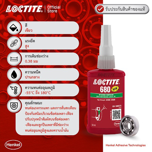 LOCTITE 680 น้ำยาตรึงเพลาแรงยึดสูงให้แรงยึดติดสูง เหมาะกับงานที่มีการเคลื่อนที่หรือ ติดขิ้นส่วนทรงกระบอกที่ต้องการกำลังมาก แนะนำให้ใช้กับ งานสวมเพลา, งานสวมเฟือง, งานส่วนพุลเล่ย์สายพาน และชิ้นงานที่มีลักษณะสวมแบบทรงกระบอก